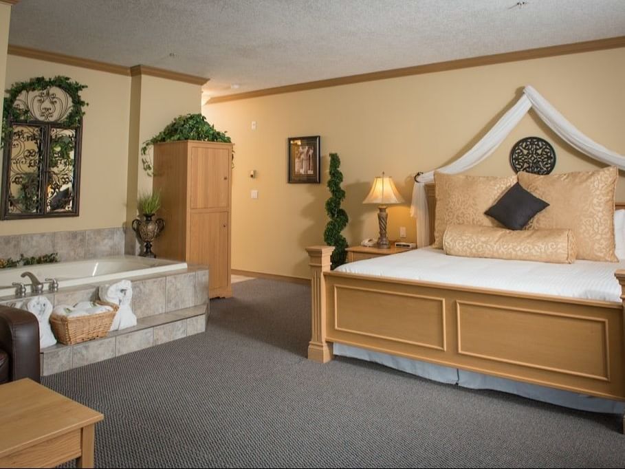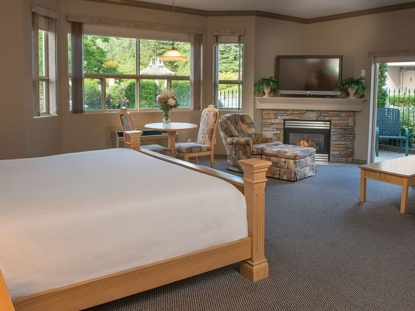 Measuring 540 square feet & located in the Inn, this suite features one King bed with a custom-made pillow top Simmons mattress as well as luxurious linens and duvets. Enjoy views of the pool, gardens and forest. Bask in the Jacuzzi by the fireplace. This room also includes a sofa bed and a dual head large walk-in shower.