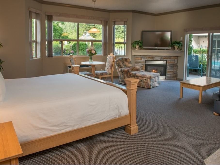 Located in the Inn, this room features two Queen beds with custom-made pillow top Simmons mattresses. Enjoy views of the seasonal outdoor pool, gardens, forest or Shuswap Lake.